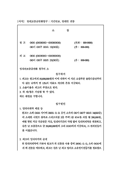 주요내용 : 임대차계약 체결 후 임대인 변경(임대인지위 매수인에게 포괄승계), 계약만료 및 명도에 따른 보증금반환을 청구하기 위한 목적으로 사용되어지는 소장 양식임. 단 무단전재 방지목적으로 PDF 파일로 올리니, 구매하신 후 혹 원본 파일이 필요하신 분들은 톡이나 문자, 메일, 전화 등을 주시면 작성방법 등에 대한 간단한 무료상담과 함께 원본 파일을 보내드리도록 하겠습니다.