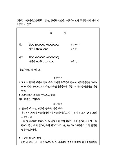 주요내용 : 부동산 상속취득, 통정허위표시에 기초한 가등기 존재, 무효를 원인으로 말소를 구하는 경우 사용되어지는 소장 양식임. 단 무단전재 방지목적으로 PDF 파일로 올리니, 구매하신 후 혹 원본 파일이 필요하신 분들은 톡이나 문자, 메일, 전화 등을 주시면 작성방법 등에 대한 간단한 무료상담과 함께 원본 파일을 보내드리도록 하겠습니다.
