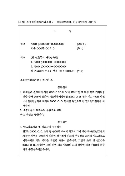 주요내용 : 계쟁물에 대한 양도담보제공 후 채무변제, 당해 등기의 말소를 구하기 위한 목적으로 사용되어지는 소장 양식임. 단 무단전재 방지목적으로 PDF 파일로 올리니, 구매하신 후 혹 원본 파일이 필요하신 분들은 톡이나 문자, 메일, 전화 등을 주시면 작성방법 등에 대한 간단한 무료상담과 함께 원본 파일을 보내드리도록 하겠습니다.