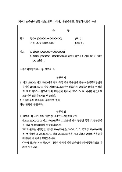 주요내용 : 매매계약체결 후 지가상승, 통정허위표시 매매, 수익자를 상대로 한 채권자대위소소을 통한 이전등기말소절차를 구하고, 매도인으로 상대로한 이전등기청구소송을 제기할 할 목적으로 사용되어지는 소장 양식임. 단 무단전재 방지목적으로 PDF 파일로 올리니, 구매하신 후 혹 원본 파일이 필요하신 분들은 톡이나 문자, 메일, 전화 등을 주시면 작성방법 등에 대한 간단한 무료상담과 함께 원본 파일을 보내드리도록 하겠습니다.