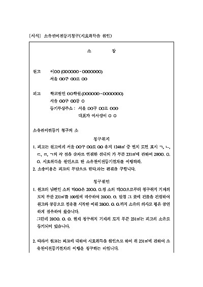 주요내용 : 소유의 의사로 평온 공연하게 타인의 부동산을 20년간 점유한 후 그에 대한 소유권이전등기를 청구할 때 사용되어지는 양식임. 단 무단전재 방지목적으로 PDF 파일로 올리니, 구매하신 후 혹 원본 파일이 필요하신 분들은 톡이나 문자, 메일, 전화 등을 주시면 작성방법 등에 대한 간단한 무료상담과 함께 원본 파일을 보내드리도록 하겠습니다.