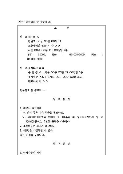주요내용 :임차인이 계약 종료 후에도 건물을 계속 점유하고 있을 때, 건물을 비워달라고(명도) 청구하고, 점유하는 동안 발생한 임대료 미납분 등 실질적인 이득을 되돌려받기(부당이득반환) 위한 목적으로 사용되어지는 소장 양식임. 단 무단전재 방지목적으로 PDF 파일로 올리니, 구매하신 후 혹 원본 파일이 필요하신 분들은 톡이나 문자, 메일, 전화 등을 주시면 작성방법 등에 대한 간단한 무료상담과 함께 원본 파일을 보내드리도록 하겠습니다.