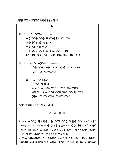 주요내용 : 분양권 등을 양도받은 양수인이 조합원 지위의 이전이라는 계약 내용을 이행시키기 위한 목적으로 사용되어지는 소장 양식임. 단 무단전재 방지목적으로 PDF 파일로 올리니, 구매하신 후 혹 원본 파일이 필요하신 분들은 톡이나 문자, 메일, 전화 등을 주시면 작성방법 등에 대한 간단한 무료상담과 함께 원본 파일을 보내드리도록 하겠습니다.