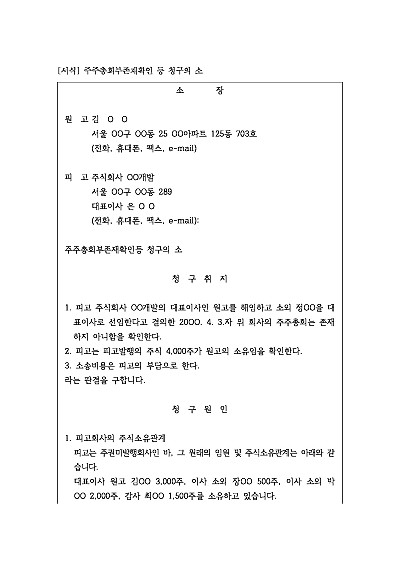 주요내용 : 주주총회 결의에 소집 절차나 결의 방법 등에 중대한 하자가 있어 사실상 존재하지 않는 결의에 대해 법원의 확인을 구하기 위한 목적으로 사용되어지는 소장 양식임. 단 무단전재 방지목적으로 PDF 파일로 올리니, 구매하신 후 혹 원본 파일이 필요하신 분들은 톡이나 문자, 메일, 전화 등을 주시면 작성방법 등에 대한 간단한 무료상담과 함께 원본 파일을 보내드리도록 하겠습니다.