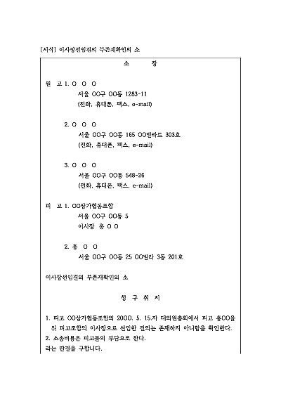 주요내용 : 이사장 선임 결의가 법적으로 존재하지 않음을 확인하여, 해당 결의를 바탕으로 한 어떠한 법적 효력도 발생하지 않게할 목적으로 사용되어지는 소장 양식임. 단 무단전재 방지목적으로 PDF 파일로 올리니, 구매하신 후 혹 원본 파일이 필요하신 분들은 톡이나 문자, 메일, 전화 등을 주시면 작성방법 등에 대한 간단한 무료상담과 함께 원본 파일을 보내드리도록 하겠습니다.