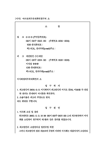 주요내용 : 정관상 이사회 소집은 대표이사의 권한, 정관규정을 위반한 이사회 소집 및 결의, 정관 규정 위반을 이우로 당해 이사회의 결의가 부존재함을 구하는 목적으로 사용되어지는 소장 양식임. 단 무단전재 방지목적으로 PDF 파일로 올리니, 구매하신 후 혹 원본 파일이 필요하신 분들은 톡이나 문자, 메일, 전화 등을 주시면 작성방법 등에 대한 간단한 무료상담과 함께 원본 파일을 보내드리도록 하겠습니다.