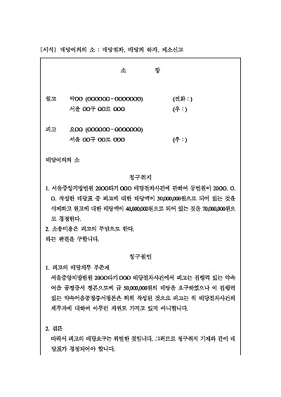 주요내용 : 피고의 배당자격 부존재, 배당하자를 이유로 배당표의 경정을 구하기 위한 목적으로 사용되어지는 소장 양식임. 단 무단전재 방지목적으로 PDF 파일로 올리니, 구매하신 후 혹 원본 파일이 필요하신 분들은 톡이나 문자, 메일, 전화 등을 주시면 작성방법 등에 대한 간단한 무료상담과 함께 원본 파일을 보내드리도록 하겠습니다.