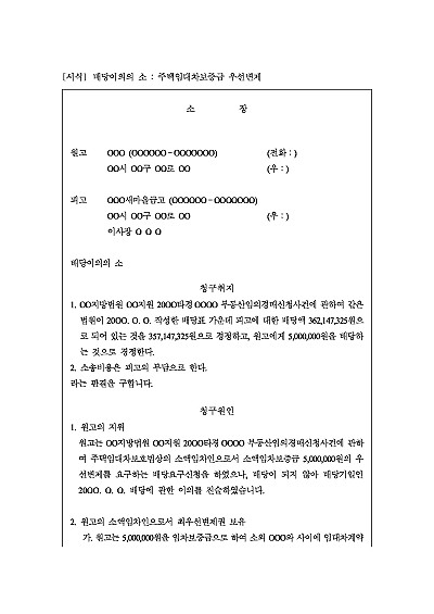 주요내용 : 경매절차, 소액임차인 우선변제권 주장, 인정되지 않음, 소액임차인 우선변제권 주장 및 그에 기초하여 기존 배댱표의 경정을 구하기 위한 목적으로 사용되어지는 소장 양식임. 단 무단전재 방지목적으로 PDF 파일로 올리니, 구매하신 후 혹 원본 파일이 필요하신 분들은 톡이나 문자, 메일, 전화 등을 주시면 작성방법 등에 대한 간단한 무료상담과 함께 원본 파일을 보내드리도록 하겠습니다.