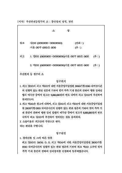 주요내용 : 채권확보를 위한 경매신청 및 목적물에 대한 압류집행, 집행전 질권존재, 이에 기하여 질권에 따른 채권 우선변제등을 청구할 목적으로 사용되어지는 소장 양식임. 단 무단전재 방지목적으로 PDF 파일로 올리니, 구매하신 후 혹 원본 파일이 필요하신 분들은 톡이나 문자, 메일, 전화 등을 주시면 작성방법 등에 대한 간단한 무료상담과 함께 원본 파일을 보내드리도록 하겠습니다.