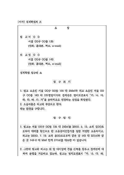 주요내용 : 인접한 토지의 경계가 불분명하여 소유자 간에 다툼이 있을 때, 법원의 판결을 통해 그 경계를 명확하게 확정하기 위한 목적으로 사용되어지는 소장 양식임. 단 무단전재 방지목적으로 PDF 파일로 올리니, 구매하신 후 혹 원본 파일이 필요하신 분들은 톡이나 문자, 메일, 전화 등을 주시면 작성방법 등에 대한 간단한 무료상담과 함께 원본 파일을 보내드리도록 하겠습니다.