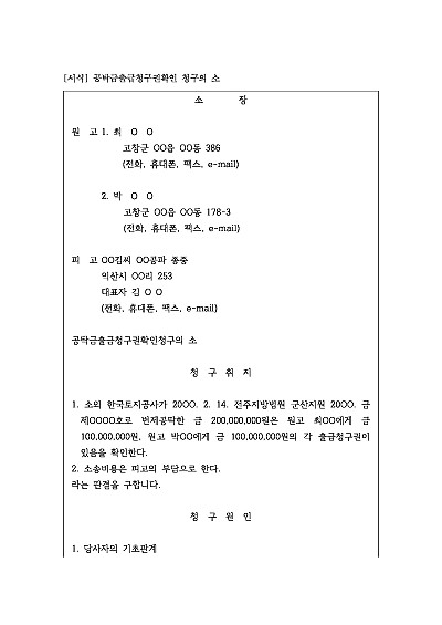 주요내용 채무 변제 시 채권자가 여러 명인 경우 등 채무자가 누구에게 돈을 지급해야 할지 불분명할 때, 공탁한 공탁금에 대한 출급청구권이 자신에게 있음을 확인받기 위한 목적으로 사용되어지는 소장 양식임단 무단전재 방지목적으로 PDF 파일로 올리니구매하신 후 혹 원본 파일이 필요하신 분들은 톡이나 문자메일전화 등을 주시면 작성방법 등에 대한 간단한 무료상담과 함께 원본 파일을 보내드리도록 하겠습니다.