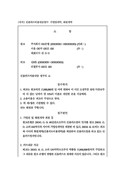 주요내용 : 가맹점계약 및 회원계약 체결 후 결제된 카드대금지급 및 미변제시 그 지급을 구하기 위한 목적으로 사용되어지는 소장 양식임. 단 무단전재 방지목적으로 PDF 파일로 올리니, 구매하신 후 혹 원본 파일이 필요하신 분들은 톡이나 문자, 메일, 전화 등을 주시면 작성방법 등에 대한 간단한 무료상담과 함께 원본 파일을 보내드리도록 하겠습니다.