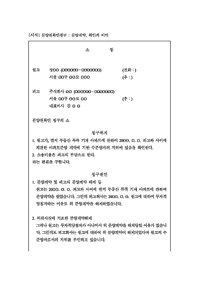 주요내용 : 분양계약, 무자격자라는 이유로 계약해지시 정당한 자격자임을 확인할 목적으로 사용되어지는 소장 양식임. 단 무단전재 방지목적으로 PDF 파일로 올리니, 구매하신 후 혹 원본 파일이 필요하신 분들은 톡이나 문자, 메일, 전화 등을 주시면 작성방법 등에 대한 간단한 무료상담과 함께 원본 파일을 보내드리도록 하겠습니다.