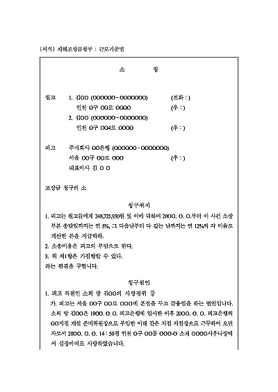 주요내용 : 근무 중 사망, 회사의 복지규정, 유족의 재해보상금 청구시 사용되어지는 소장 양식임. 단 무단전재 방지목적으로 PDF 파일로 올리니, 구매하신 후 혹 원본 파일이 필요하신 분들은 톡이나 문자, 메일, 전화 등을 주시면 작성방법 등에 대한 간단한 무료상담과 함께 원본 파일을 보내드리도록 하겠습니다.