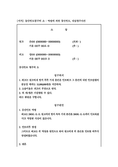 주요내용 : 인도약정, 인도청구, 인도불능시 대상청구를 목적으로 사용되어지는 소장 양식임. 단 무단전재 방지목적으로 PDF 파일로 올리니, 구매하신 후 혹 원본 파일이 필요하신 분들은 톡이나 문자, 메일, 전화 등을 주시면 작성방법 등에 대한 간단한 무료상담과 함께 원본 파일을 보내드리도록 하겠습니다.