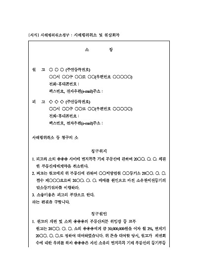 주요내용 : 채무자 무자력, 사해행위, 악의적 수익자에 대하여 사해행위에 기한 매매계약취소 및 원상회복으로 그에 기초한 소유권이전등기말소 청구 등을 구할 목적으로 사용되어지는 소장 양식임. 단 무단전재 방지목적으로 PDF 파일로 올리니구매하신 후 혹 원본 파일이 필요하신 분들은 톡이나 문자메일전화 등을 주시면 작성방법 등에 대한 간단한 무료상담과 함께 원본 파일을 보내드리도록 하겠습니다