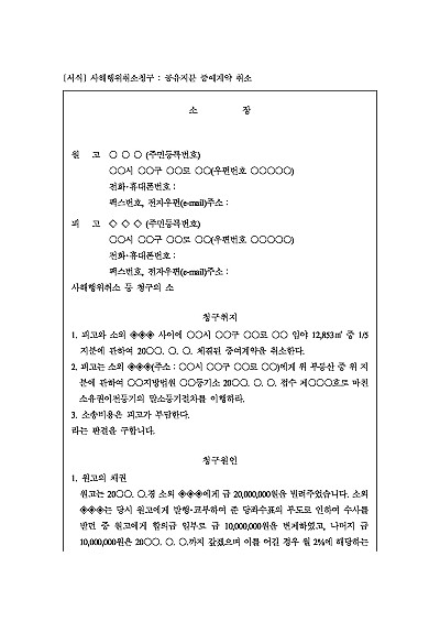 주요내용 : 채무자 무자력, 사해행위, 악의적 수익자에 대하여 사해행위에 기한 매매계약취소 및 원상회복으로 그에 기초한 소유권이전등기말소 청구 등을 구할 목적으로 사용되어지는 소장 양식임. 단 무단전재 방지목적으로 PDF 파일로 올리니구매하신 후 혹 원본 파일이 필요하신 분들은 톡이나 문자메일전화 등을 주시면 작성방법 등에 대한 간단한 무료상담과 함께 원본 파일을 보내드리도록 하겠습니다