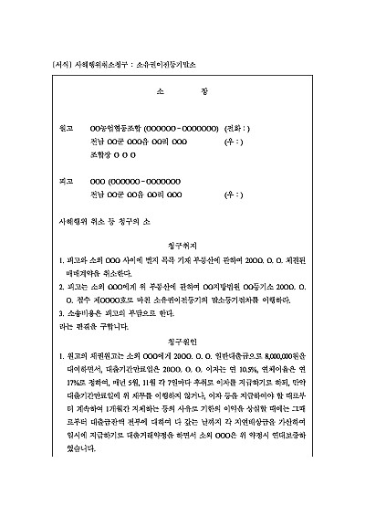 주요내용 : 악의적 수익자에 대하여 사해행위에 기한 매매계약취소 및 그에 기초한 소유권이전등기말소 청구 등을 구할 목적으로 사용되어지는 소장 양식임. 단 무단전재 방지목적으로 PDF 파일로 올리니구매하신 후 혹 원본 파일이 필요하신 분들은 톡이나 문자메일전화 등을 주시면 작성방법 등에 대한 간단한 무료상담과 함께 원본 파일을 보내드리도록 하겠습니다.