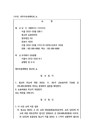 주요내용 채무자가 채권자의 변제 독촉으로부터 벗어나기 위해 채무가 존재하지 않음을 법적으로 확인받기 위한 목적으로 사용되어지는 소장 양식임단 무단전재 방지목적으로 PDF 파일로 올리니구매하신 후 혹 원본 파일이 필요하신 분들은 톡이나 문자메일전화 등을 주시면 작성방법 등에 대한 간단한 무료상담과 함께 원본 파일을 보내드리도록 하겠습니다.
