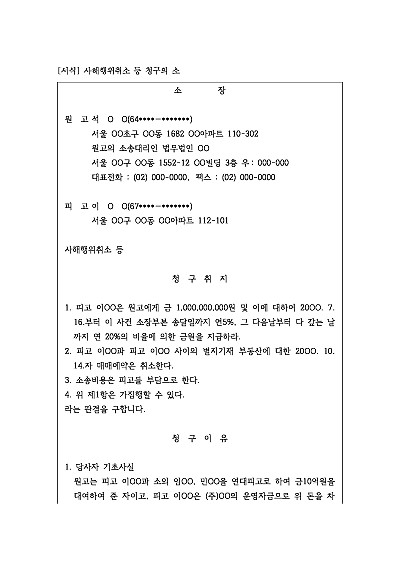 주요내용 : 채무자가 채권자의 채권 회수를 피하기 위해 재산을 숨기거나 빼돌리는 행위(사해행위)를 법적으로 취소시켜, 채무자의 재산을 원래 상태로 회복시키기 위한 목적으로 사용되어지는 소장 양식임. 단 무단전재 방지목적으로 PDF 파일로 올리니, 구매하신 후 혹 원본 파일이 필요하신 분들은 톡이나 문자, 메일, 전화 등을 주시면 작성방법 등에 대한 간단한 무료상담과 함께 원본 파일을 보내드리도록 하겠습니다.
