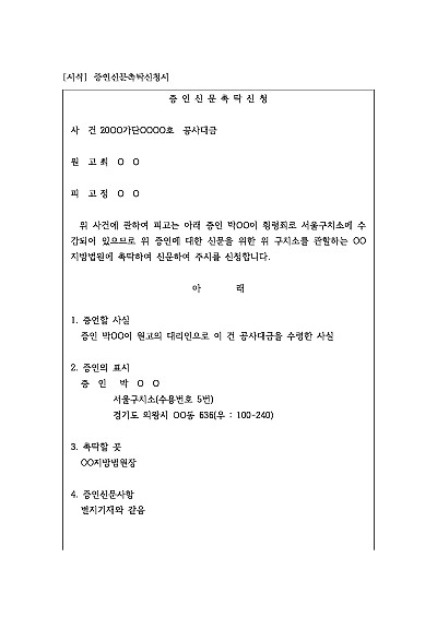 주요내용 :증인이 현재 소송이 진행 중인 법원의 관할 구역 내에 거주하지 않거나, 기타의 사유로 공판 기일에 직접 출석하기 어려운 경우, 해당 증인이 거주하는 곳을 관할하는 지방법원 등의 법관(수탁판사)에게 증인 신문을 위임하여 진행하기 위한 목적으로 사용되어지는 신청서 양식임. 단 무단전재 방지목적으로 PDF 파일로 올리니, 구매하신 후 혹 원본 파일이 필요하신 분들은 톡이나 문자, 메일, 전화 등을 주시면 작성방법 등에 대한 간단한 무료상담과 함께 원본 파일을 보내드리도록 하겠습니다.