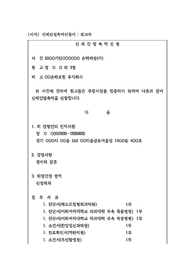 주요내용 : 교통사고와 같은 소송에서 피해자의 상해 정도나 후유증 등 신체 관련 사항에 대해 법원이 전문의사에게 객관적인 감정을 의뢰하기 위한 목적으로 사용되어지는 신청서 양식임. 단 무단전재 방지목적으로 PDF 파일로 올리니, 구매하신 후 혹 원본 파일이 필요하신 분들은 톡이나 문자, 메일, 전화 등을 주시면 작성방법 등에 대한 간단한 무료상담과 함께 원본 파일을 보내드리도록 하겠습니다.