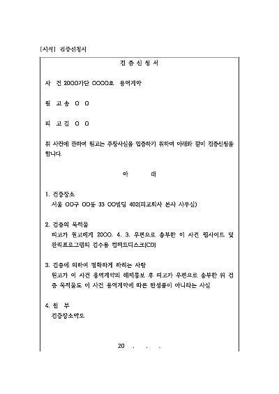 주요내용 : 법관이 사물의 성상이나 현장을 직접 보고 듣는 등 오감으로 확인하여 증거를 조사하는 검증절차를 신청할 목적으로 사용되어지는 신청서 양식임. 단 무단전재 방지목적으로 PDF 파일로 올리니구매하신 후 혹 원본 파일이 필요하신 분들은 톡이나 문자메일전화 등을 주시면 작성방법 등에 대한 간단한 무료상담과 함께 원본 파일을 보내드리도록 하겠습니다.