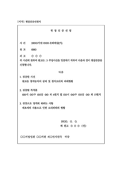 주요내용 : 사건 현장을 직접 확인하여 서류나 진술만으로는 알기 어려운 객관적인 사실을 파악하고, 진술이 현장 상황과 일치하는지, 모순점은 없는지 등을 검증하기 위한 목적으로 사용되어지는 신청서 양식임. 단 무단전재 방지목적으로 PDF 파일로 올리니, 구매하신 후 혹 원본 파일이 필요하신 분들은 톡이나 문자, 메일, 전화 등을 주시면 작성방법 등에 대한 간단한 무료상담과 함께 원본 파일을 보내드리도록 하겠습니다.
