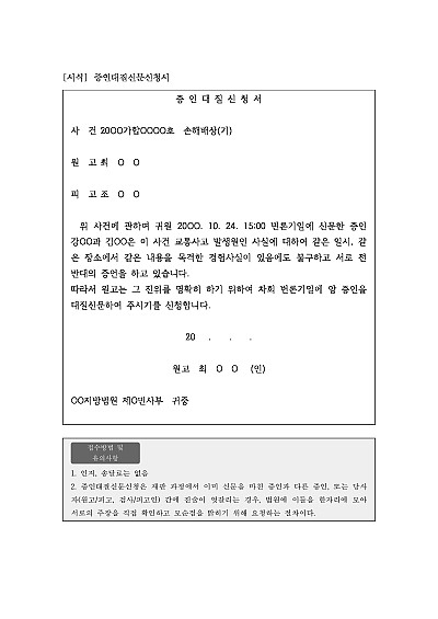 주요내용 : 재판 과정에서 이미 신문을 마친 증인과 다른 증인, 또는 당사자 간에 진술이 엇갈리는 경우, 법원에 이들을 한자리에 모아 서로의 주장을 직접 확인하고 모순점을 밝히기 위한 목적으로 사용되어지는 신청서 양식임. 단 무단전재 방지목적으로 PDF 파일로 올리니, 구매하신 후 혹 원본 파일이 필요하신 분들은 톡이나 문자, 메일, 전화 등을 주시면 작성방법 등에 대한 간단한 무료상담과 함께 원본 파일을 보내드리도록 하겠습니다.
