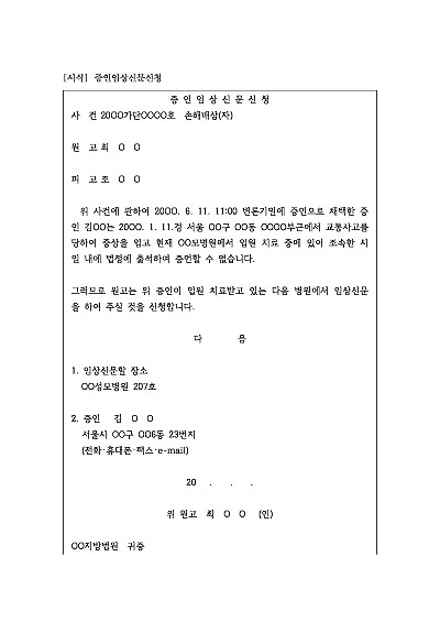 주요내용 : 중상으로 인한 병원입원 등으로 이유로 법정에 출석하여 증언하는 것이 불가한 경우, 증인이 입원치료 등을 받고 있는 볍원에서 임상신문을 하여줄 것을 청구할 목적으로 사용되어지는 신청서 양식임. 단 무단전재 방지목적으로 PDF 파일로 올리니, 구매하신 후 혹 원본 파일이 필요하신 분들은 톡이나 문자, 메일, 전화 등을 주시면 작성방법 등에 대한 간단한 무료상담과 함께 원본 파일을 보내드리도록 하겠습니다.