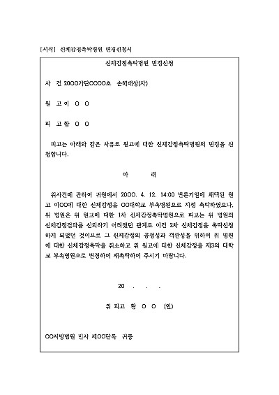 주요내용 : 신체감정병원 지정 후 신체감정의 객관성과 공정성 확보를 위해 제3의 병원을 신체감정 변원으로의 변경을 구할 목적으로 사용되어지는 신청서 양식임. 단 무단전재 방지목적으로 PDF 파일로 올리니, 구매하신 후 혹 원본 파일이 필요하신 분들은 톡이나 문자, 메일, 전화 등을 주시면 작성방법 등에 대한 간단한 무료상담과 함께 원본 파일을 보내드리도록 하겠습니다.