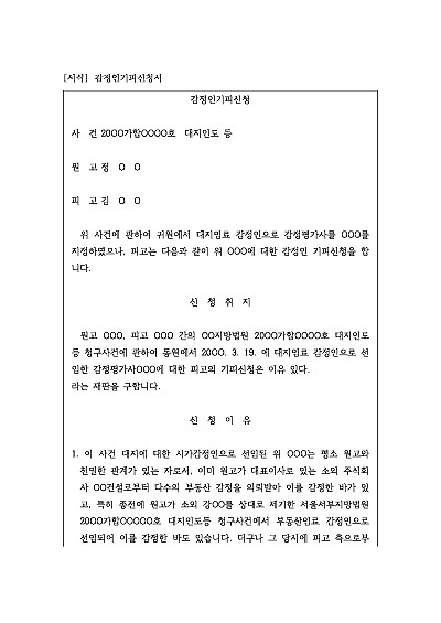 주요내용 : 소송에서 법원의 명령에 따라 전문적인 지식으로 감정을 담당하는 감정인이 공정하고 성실하게 감정하기 어려운 사유가 있을 때, 당사자가 해당 감정인을 재판에서 배제를 구하기 위한 목적으로 사용되어지는 신청서 양식임. 단 무단전재 방지목적으로 PDF 파일로 올리니, 구매하신 후 혹 원본 파일이 필요하신 분들은 톡이나 문자, 메일, 전화 등을 주시면 작성방법 등에 대한 간단한 무료상담과 함께 원본 파일을 보내드리도록 하겠습니다.