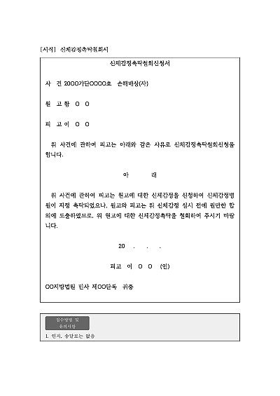 주요내용 : 신체감정촉탁 후 합의 등 사정에 의하여 기 신청된 감정신청을 철회하기 위한 목적으로 사용되어지는 신청서 양식임. 단 무단전재 방지목적으로 PDF 파일로 올리니, 구매하신 후 혹 원본 파일이 필요하신 분들은 톡이나 문자, 메일, 전화 등을 주시면 작성방법 등에 대한 간단한 무료상담과 함께 원본 파일을 보내드리도록 하겠습니다.