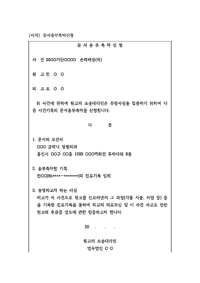 주요내용 : 증명할 문서가 국가기관, 법인, 학교, 병원 등에 보관되어 있는 경우 법원이 해당 기관에 문서 제출을 요청하도록 신청할 목적으로 사용되어지는 신청서 양식임. 단 무단전재 방지목적으로 PDF 파일로 올리니구매하신 후 혹 원본 파일이 필요하신 분들은 톡이나 문자메일전화 등을 주시면 작성방법 등에 대한 간단한 무료상담과 함께 원본 파일을 보내드리도록 하겠습니다.