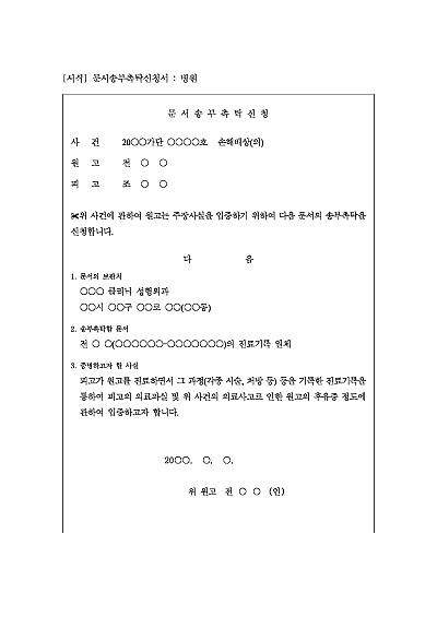 주요내용 : 증명할 문서가 국가기관, 법인, 학교, 병원 등에 보관되어 있는 경우 법원이 해당 기관에 문서 제출을 요청하도록 신청할 목적으로 사용되어지는 신청서 양식임. 단 무단전재 방지목적으로 PDF 파일로 올리니구매하신 후 혹 원본 파일이 필요하신 분들은 톡이나 문자메일전화 등을 주시면 작성방법 등에 대한 간단한 무료상담과 함께 원본 파일을 보내드리도록 하겠습니다.