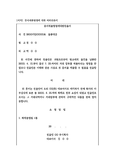 주요내용 : 문서 소지자가 제출 의무가 없거나, 문서의 존재를 부인하거나, 기타 사유로 문서 제출을 거부해야 할 경우에 해당 의견을 법원에 전달하여 제출 명령의 허가 여부를 판단하게할 목적으로 사용되어지는 진술서 양식임. 단 무단전재 방지목적으로 PDF 파일로 올리니, 구매하신 후 혹 원본 파일이 필요하신 분들은 톡이나 문자, 메일, 전화 등을 주시면 작성방법 등에 대한 간단한 무료상담과 함께 원본 파일을 보내드리도록 하겠습니다.