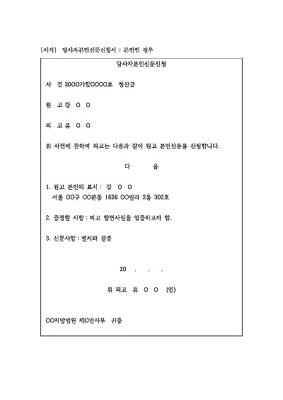 주요내용 : 소송 당사자 본인을 직접 신문하여 사건의 쟁점이나 사실관계를 명확히 하고 재판부의 심정형성에 도움을 주고자 하는 목적으로 사용되어지는 신청서 양식임. 단 무단전재 방지목적으로 PDF 파일로 올리니, 구매하신 후 혹 원본 파일이 필요하신 분들은 톡이나 문자, 메일, 전화 등을 주시면 작성방법 등에 대한 간단한 무료상담과 함께 원본 파일을 보내드리도록 하겠습니다.