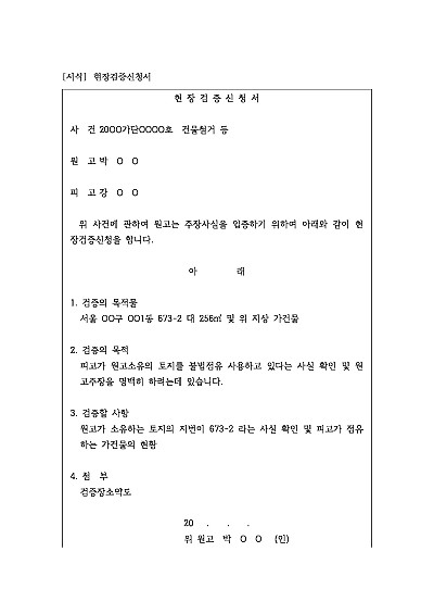주요내용 : 법관이 사물의 성상이나 현장을 직접 보고 듣는 등 오감으로 확인하여 증거를 조사하는 검증절차를 신청할 목적으로 사용되어지는 신청서 양식임. 단 무단전재 방지목적으로 PDF 파일로 올리니구매하신 후 혹 원본 파일이 필요하신 분들은 톡이나 문자메일전화 등을 주시면 작성방법 등에 대한 간단한 무료상담과 함께 원본 파일을 보내드리도록 하겠습니다
