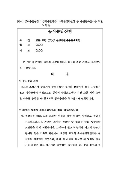 주요내용 : 소송 상대방의 주소나 근무지를 알 수 없어 서류 전달이 불가능할 때, 법원 게시판 등에 내용을 게시하고 2주(14일)가 지나면 송달된 것으로 간주하는 법적 절차임. 단 무단전재 방지 목적으로 PDF 파일로 올리니, 구매하신 후 혹 원본 파일이 필요하신 분들은 톡이나 문자, 메일, 전화 등을 주시면 작성 방법 등에 대한 간단한 무료 상담과 함께 원본 파일을 보내드리도록 하겠습니다.