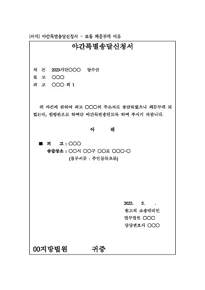 [로펌제작] 야간특별송달신청서 – 보통 폐문부재 이유 요약정보 및 구매