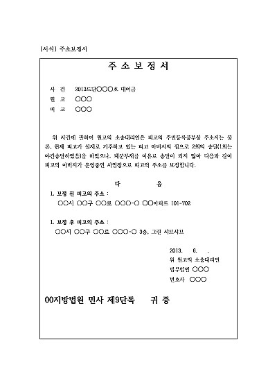 주요내용 소송(민사, 가사 등) 중 피고(상대방)의 주소가 불명확하거나 변경되어 소장 등 법원 서류가 송달되지 않을 때, 법원의 명령을 받아 정확한 주소로 수정하거나 주민등록초본을 첨부하여 제출하는 공식 문서 양식임단 무단전재 방지 목적으로 PDF 파일로 올리니구매하신 후 혹 원본 파일이 필요하신 분들은 톡이나 문자메일전화 등을 주시면 작성 방법 등에 대한 간단한 무료 상담과 함께 원본 파일을 보내드리도록 하겠습니다.