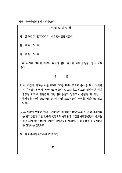 주요내용 : 당사자가 법원으로부터 온 서류를 직접 받지 못할 경우 법원에서 해당 서류를 등기우편으로 발송하여 송달의 효력을 발생시기키 위한 목적으로 사용되어지는 신청서 양식임. 단 무단전재 방지목적으로 PDF 파일로 올리니, 구매하신 후 혹 원본 파일이 필요하신 분들은 톡이나 문자, 메일, 전화 등을 주시면 작성방법 등에 대한 간단한 무료상담과 함께 원본 파일을 보내드리도록 하겠습니다.