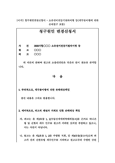 [로펌제작] 청구원인변경신청서 – 소유권이전등기절차이행 등(채무불이행에 대한 손배청구 포함) 요약정보 및 구매