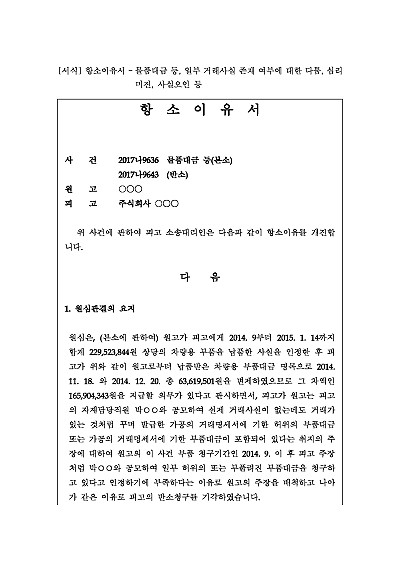 주요내용 : 1심 판결에 불복하는 구체적인 이유를 상세히 밝혀 항소심 재판부가 쟁점을 파악하고 효율적인 심리를 진행하기 위한 목적으로 사용되어지는 양식임. 단 무단전재 방지목적으로 PDF 파일로 올리니, 구매하신 후 혹 원본 파일이 필요하신 분들은 톡이나 문자, 메일, 전화 등을 주시면 작성방법 등에 대한 간단한 무료상담과 함께 원본 파일을 보내드리도록 하겠습니다.