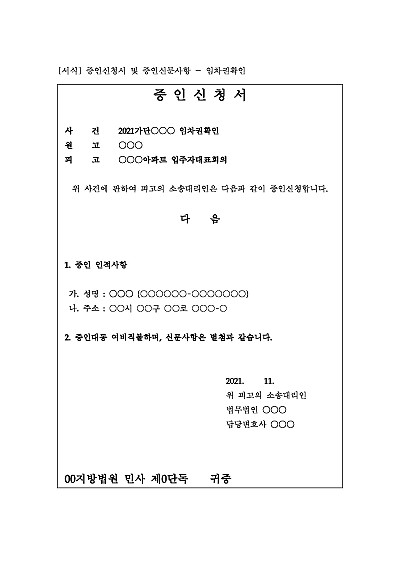 주요내용 : 소송에서 증언을 통해 특정 사실을 증명하기 위해 법원에 제출하는 서류로, 사건 번호, 당사자 및 증인 인적사항, 증인이 사건을 알게 된 경위, 증인에게 확인할 사항, 증인신문 방식 등을 기재하여 법원에 증인 채택을 요청하는 문서 양식임. 단 무단전재 방지목적으로 PDF 파일로 올리니, 구매하신 후 혹 원본 파일이 필요하신 분들은 톡이나 문자, 메일, 전화 등을 주시면 작성방법 등에 대한 간단한 무료상담과 함께 원본 파일을 보내드리도록 하겠습니다.