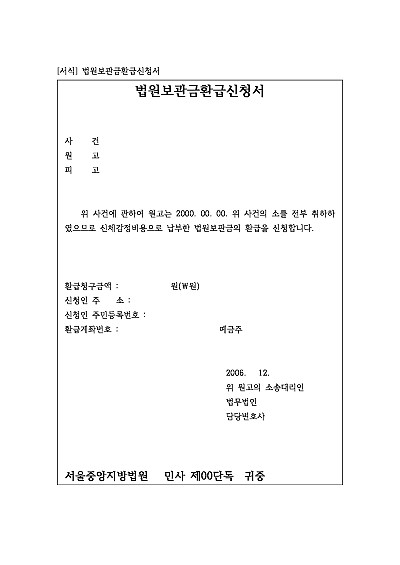 주요내용 : 민사, 경매 등 소송 과정에서 법원에 납부했던 예납금, 매각대금, 보증금 중 남은 금액(잔액)을 돌려받기 위해 법원에 제출하는 서류 양식임. 단 무단전재 방지목적으로 PDF 파일로 올리니, 구매하신 후 혹 원본 파일이 필요하신 분들은 톡이나 문자, 메일, 전화 등을 주시면 작성방법 등에 대한 간단한 무료상담과 함께 원본 파일을 보내드리도록 하겠습니다.