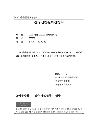 주요내용 : 민사소송 등 법적 절차에서 당사자가 이전에 신청했던 감정(신체, 필적, 부동산 등)을 더 이상 진행하지 않겠다고 법원에 서면으로 요청하기 위한 목적으로 사용되어지는 신청서 양식임. 단 무단전재 방지목적으로 PDF 파일로 올리니, 구매하신 후 혹 원본 파일이 필요하신 분들은 톡이나 문자, 메일, 전화 등을 주시면 작성방법 등에 대한 간단한 무료상담과 함께 원본 파일을 보내드리도록 하겠습니다.