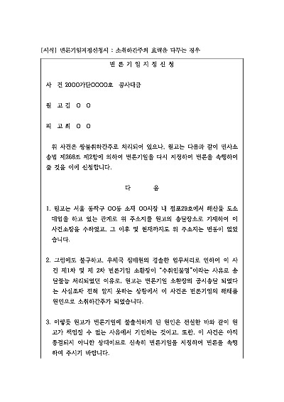 주요내용 : 법원이 기일을 지정하지 않아 사건이 장기간 계류 중일 때, 소송을 더 이상 지연시키지 않고 신속한 해결을 목적으로 사용하거나 또는 두 차례 이상 원고가 변론기일에 불출석한 후에는 소송이 각하될 수 있으므로, 이를 방지하기 위한 목적으로 사용되어지는 신청서 양식임. 단 무단전재 방지목적으로 PDF 파일로 올리니구매하신 후 혹 원본 파일이 필요하신 분들은 톡이나 문자메일전화 등을 주시면 작성방법 등에 대한 간단한 무료상담과 함께 원본 파일을 보내드리도록 하겠습니다.