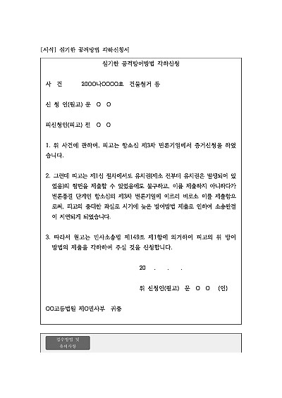 주요내용 : 상대방이 고의 또는 중대한 과실로 소송을 지연시키기 위해 너무 늦게 공격 또는 방어방법을 제출했을 때, 법원이 이를 받아들이지 않도록 막기 위한 목적에서 사용되어지는 신청서 양식임. 단 무단전재 방지목적으로 PDF 파일로 올리니, 구매하신 후 혹 원본 파일이 필요하신 분들은 톡이나 문자, 메일, 전화 등을 주시면 작성방법 등에 대한 간단한 무료상담과 함께 원본 파일을 보내드리도록 하겠습니다.