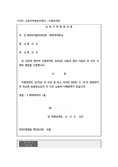 주요내용 : 소송에 이해관계가 있는 자제3자 자신의 권리를 보호하거나 구제를 받기 위해 소송기록을 확인하는 목적으로 사용되어지는 신청서 양식임. 단 무단전재 방지목적으로 PDF 파일로 올리니, 구매하신 후 혹 원본 파일이 필요하신 분들은 톡이나 문자, 메일, 전화 등을 주시면 작성방법 등에 대한 간단한 무료상담과 함께 원본 파일을 보내드리도록 하겠습니다.